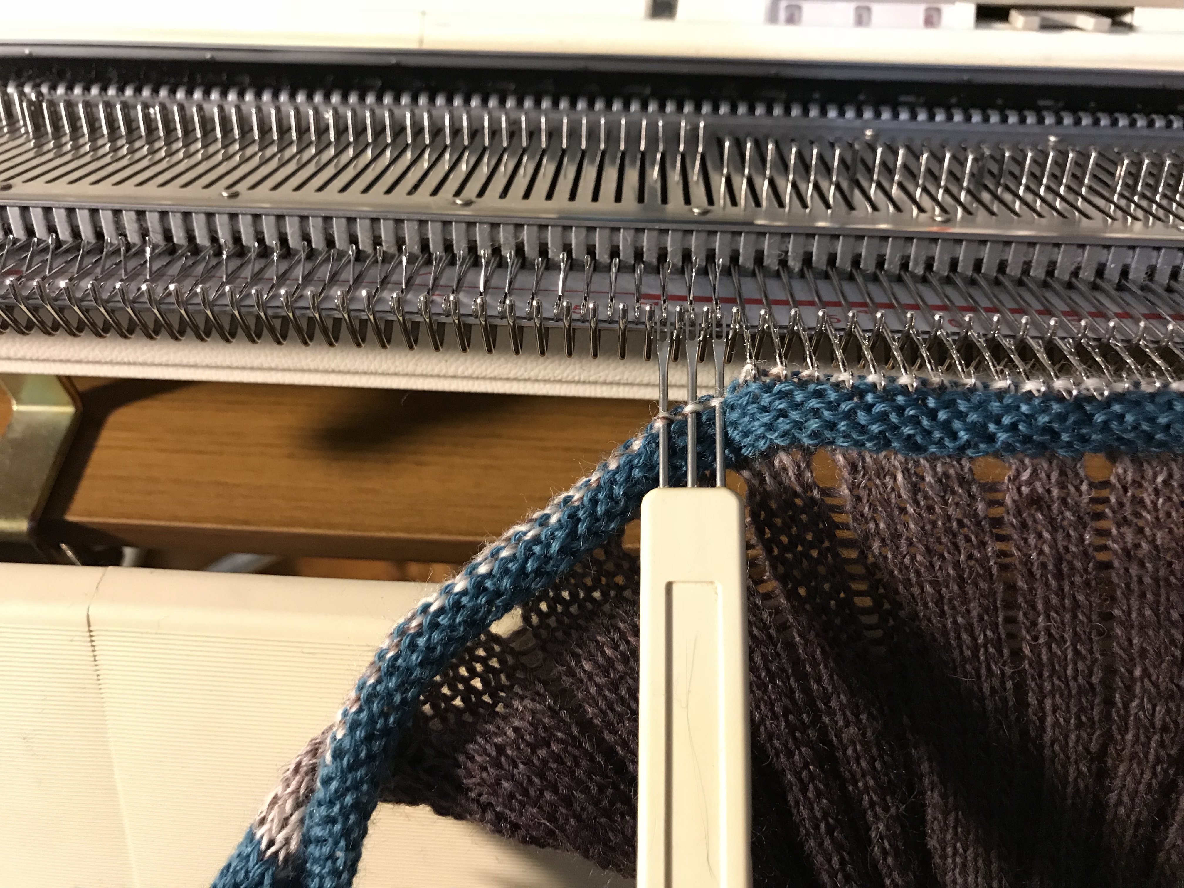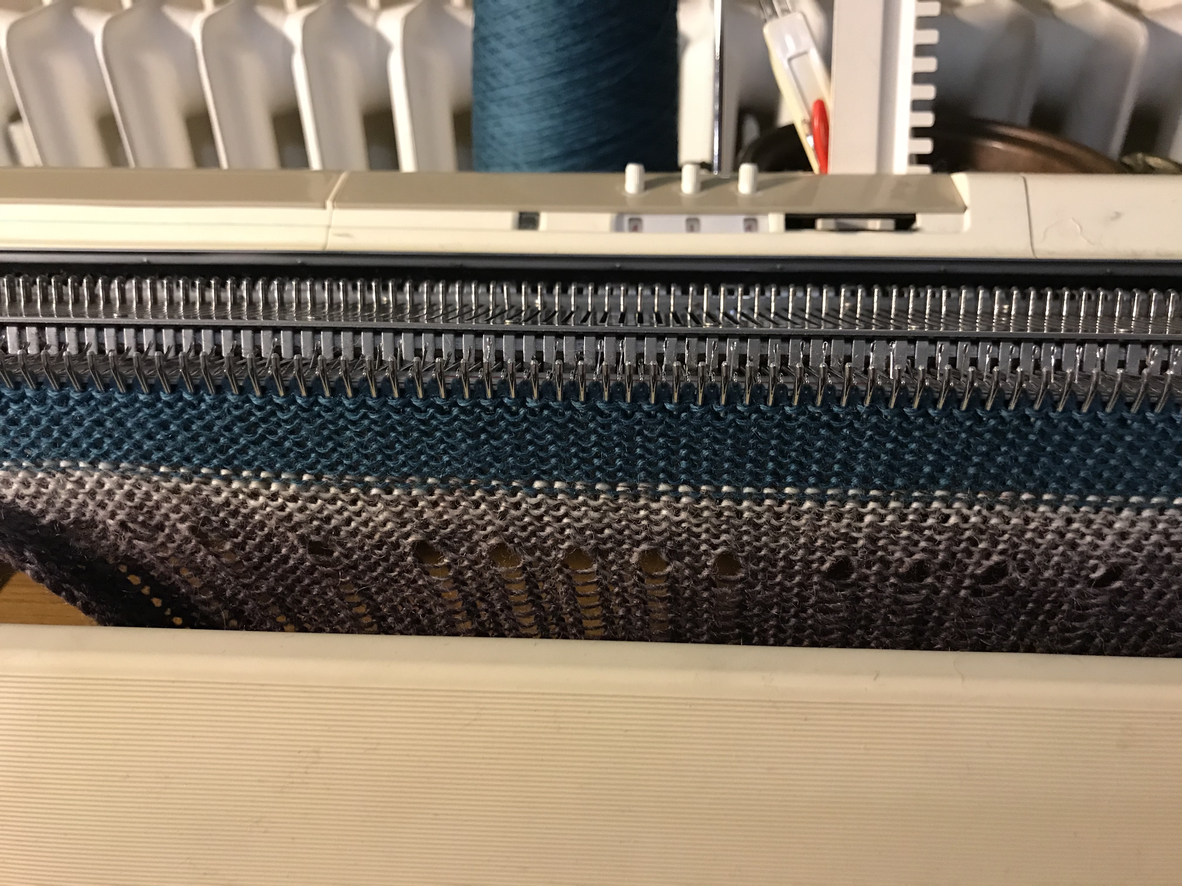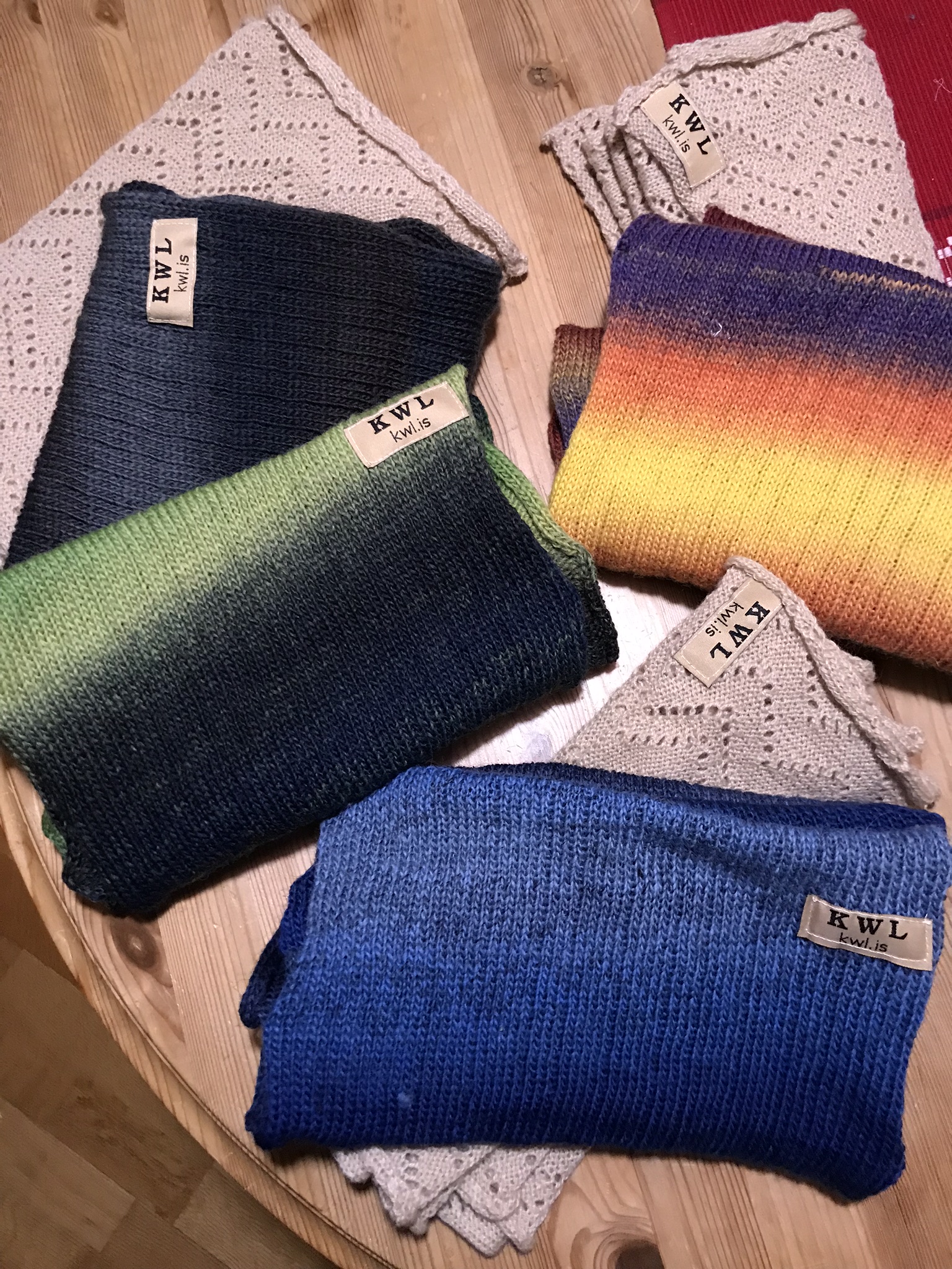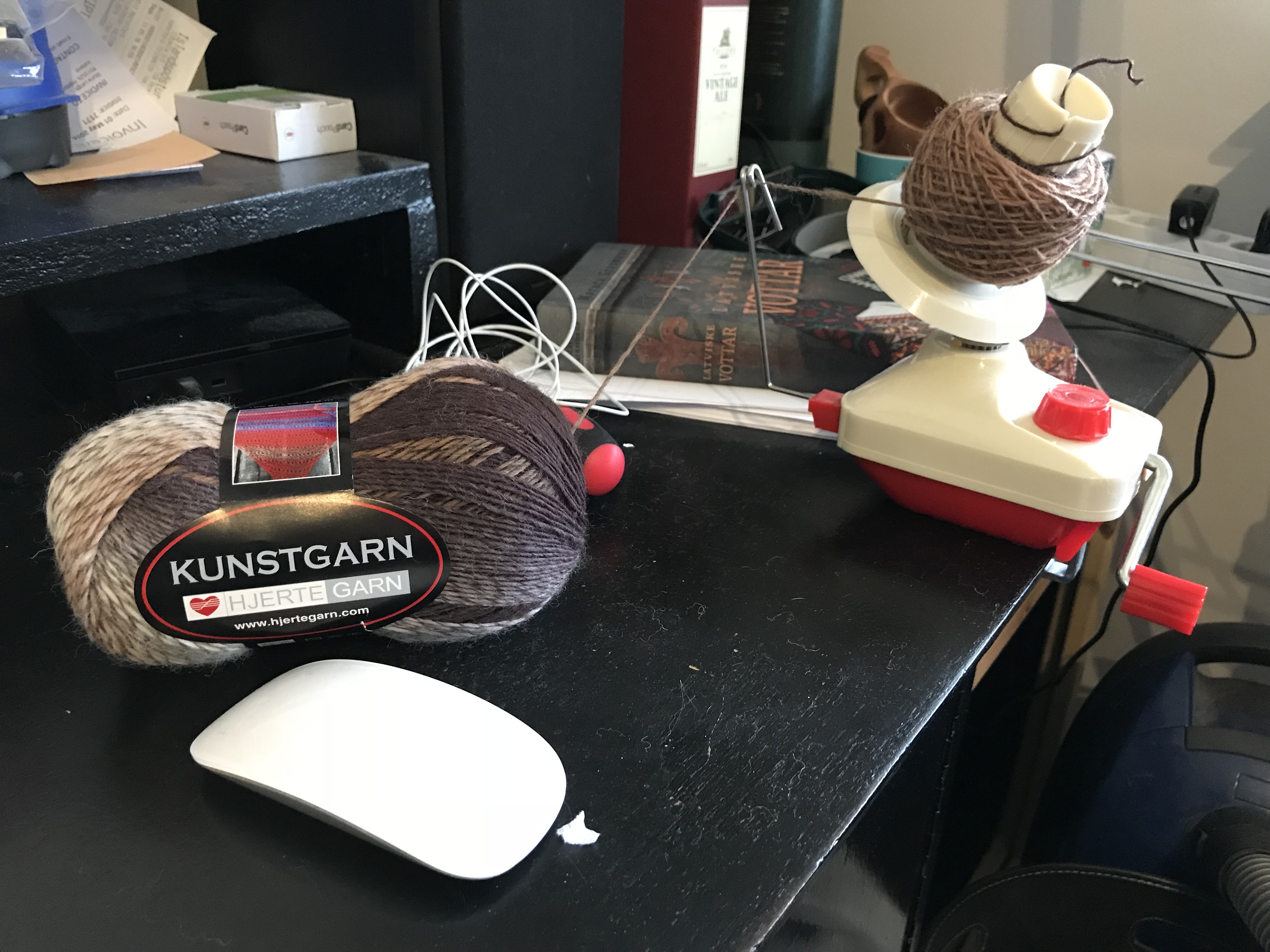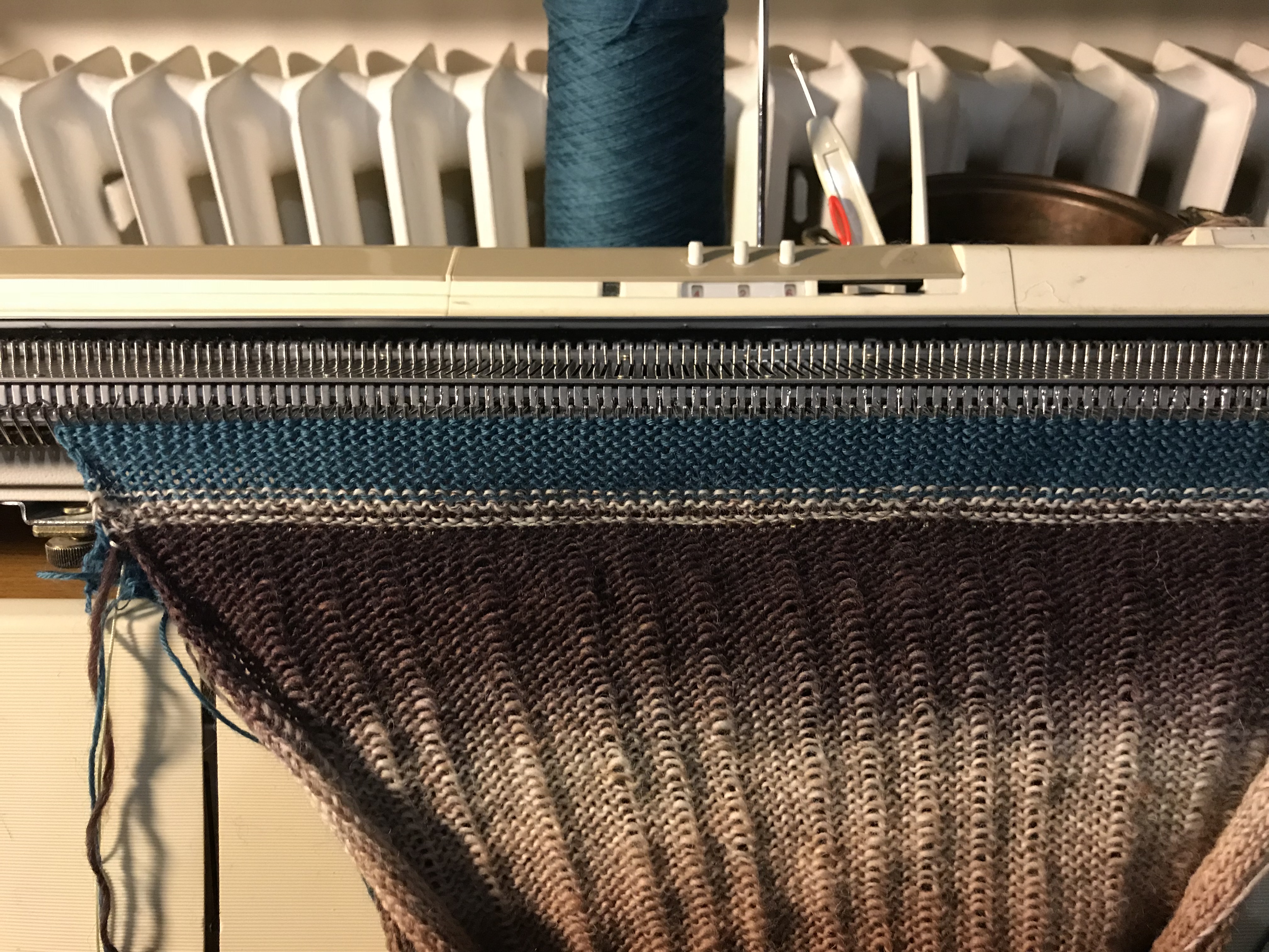 Last weekend we had our share of winter, it was a snowstorm out there and when the weather behaves like that there is nothing better than to stay indoors and knit. I have always been fond of colorful items and try to use colors in accessories as I, like so many other dress to much in black. I wanted to make something where the wonderful play of colors of the Kunstgarn from Hjertegarn would emerge and these simple yet colourful cowls were just the thing to make. It is made on my Brother 950. I have made several of them in some of the different colors of this soft yarn.