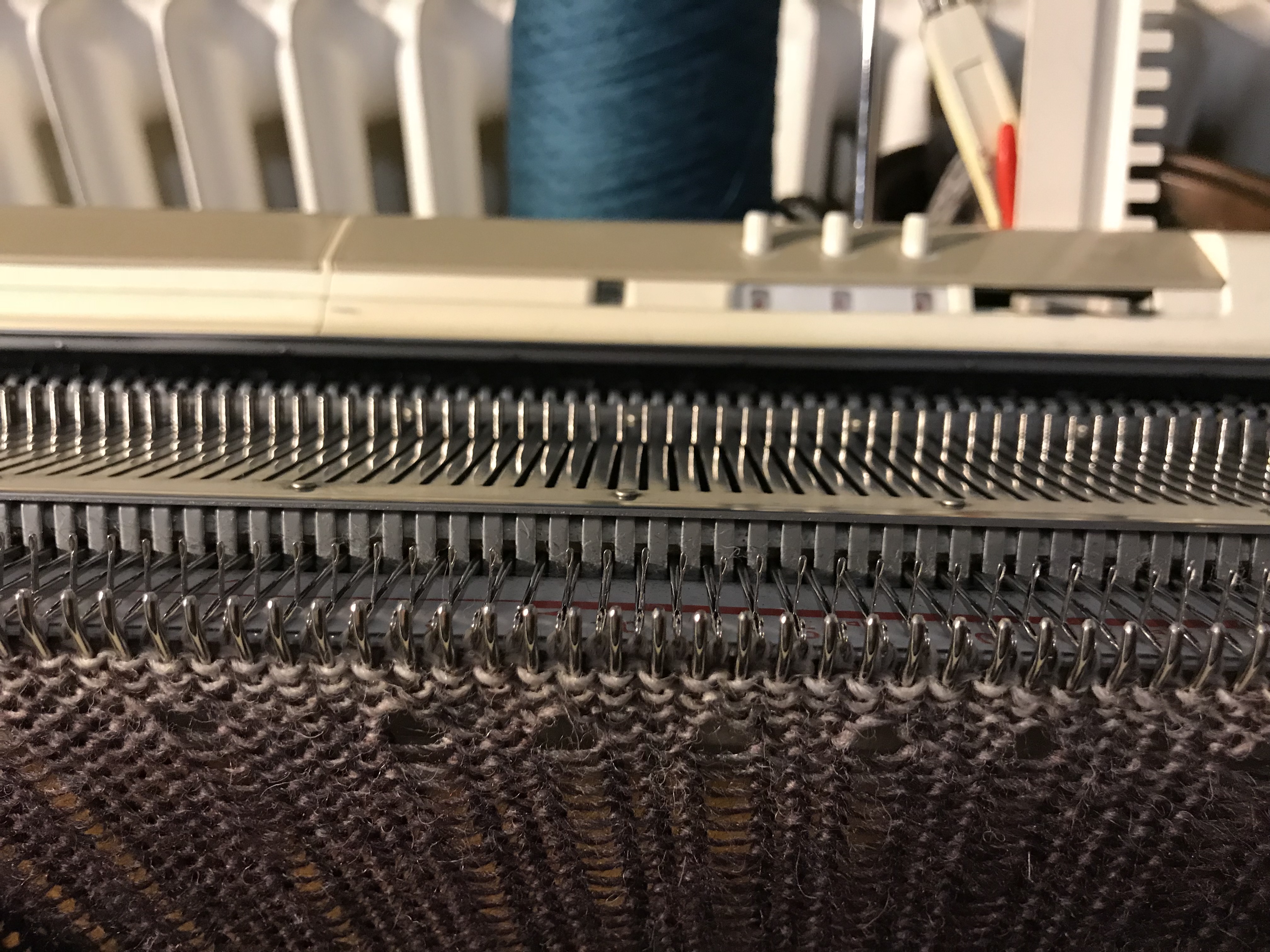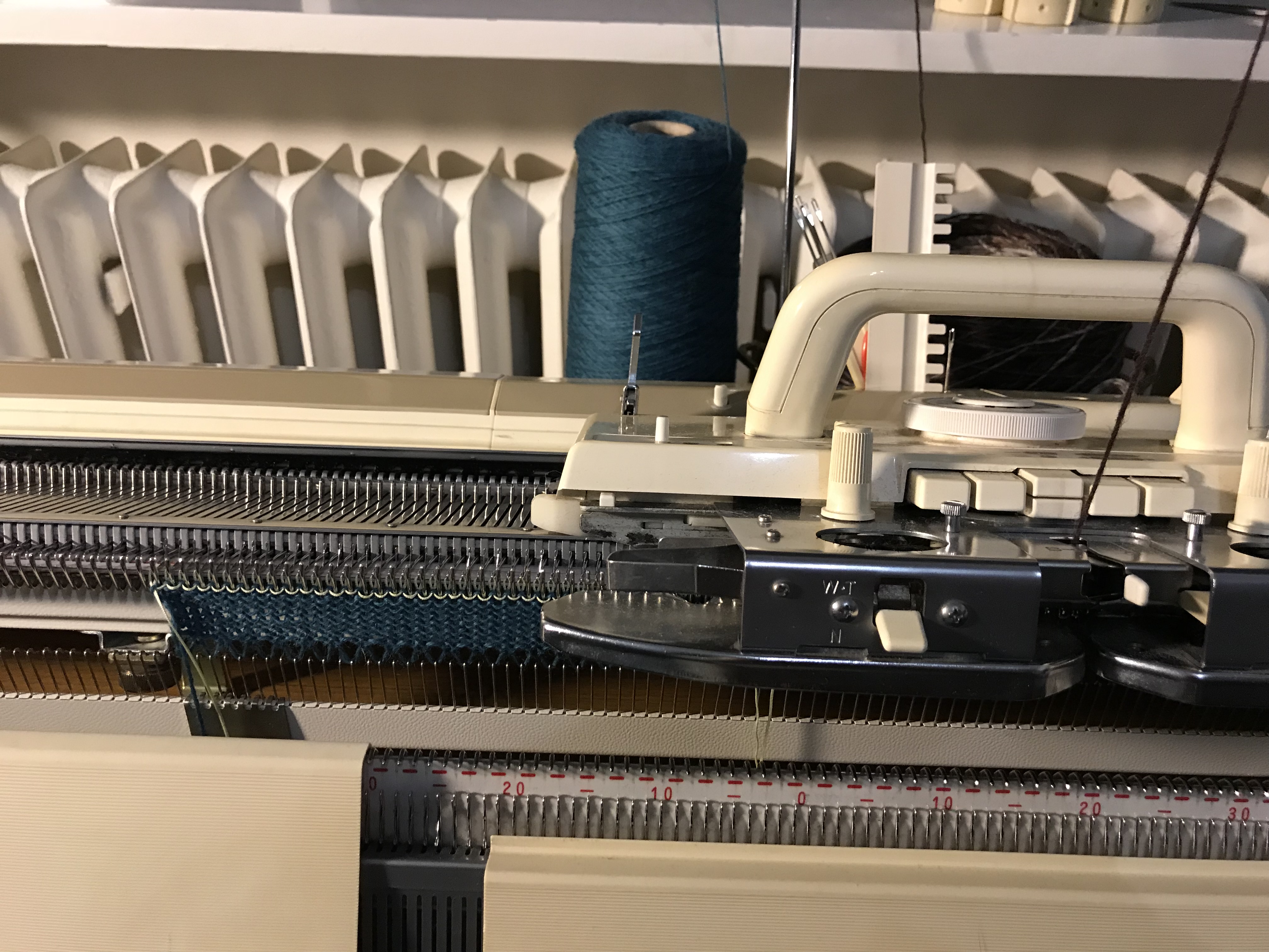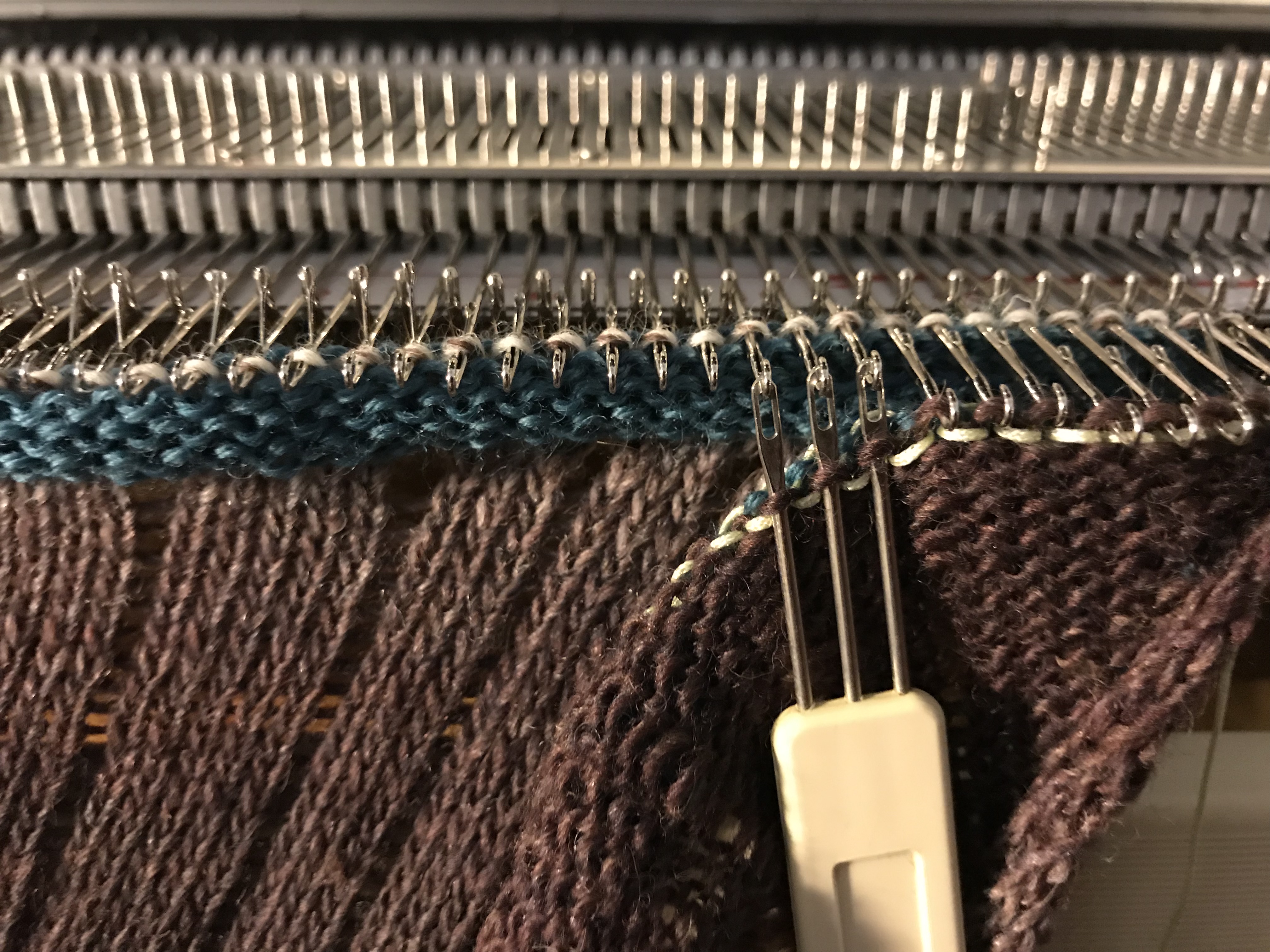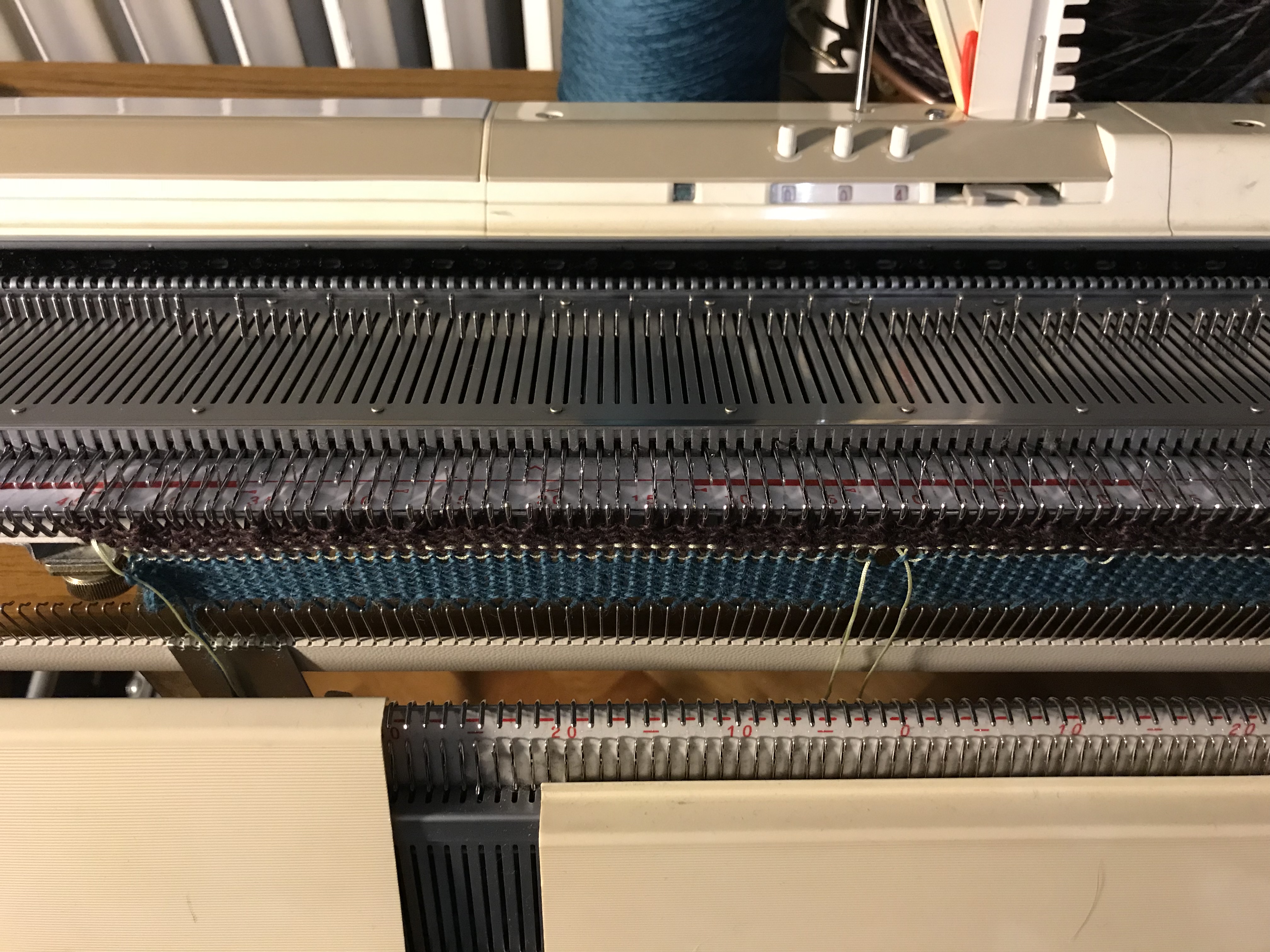 Last weekend we had our share of winter, it was a snowstorm out there and when the weather behaves like that there is nothing better than to stay indoors and knit. I have always been fond of colorful items and try to use colors in accessories as I, like so many other dress to much in black. I wanted to make something where the wonderful play of colors of the Kunstgarn from Hjertegarn would emerge and these simple yet colourful cowls were just the thing to make. It is made on my Brother 950. I have made several of them in some of the different colors of this soft yarn.