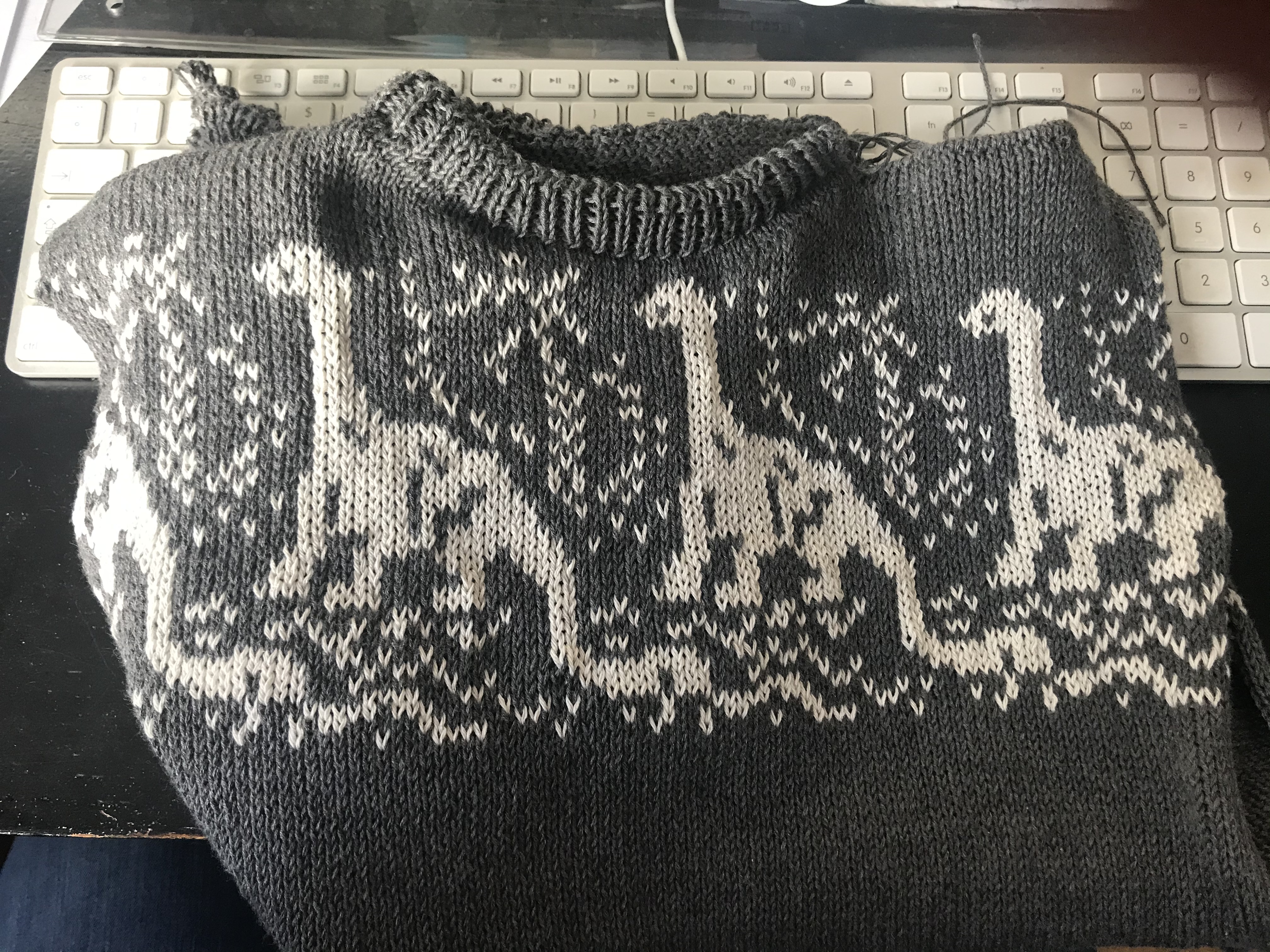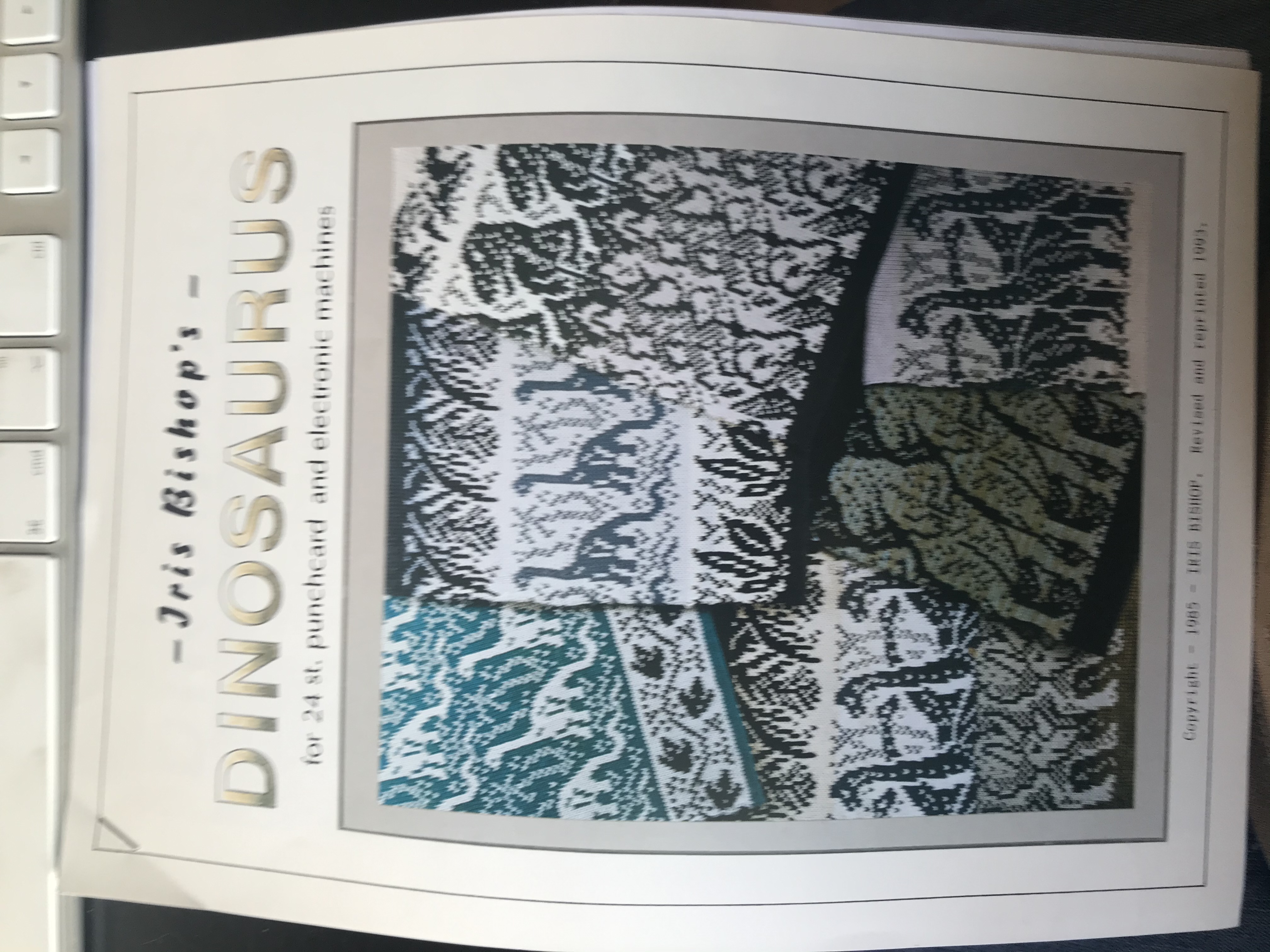 I don't think that I have ever met a 4-6 year old that is not fascinated by dinosaurs, and well perhaps not only that age is. I have a pamphlet with dinosaur designs by Irish Bishop. I find that these work quite well on sweaters and pants. One of them is a Mini brontosaurus. Brontosaurus had a long, thin neck and a small head adapted for a herbivorous lifestyle; a bulky, heavy torso; and a long, whip-like tail. The species lived during the Jurassic epoch in North America, Adult individuals of Brontosaurus are estimated to have weighed 15 tonnes and been 22 metres long. Brontosaurus is one of the best-known dinosaurs and has been featured in film, advertising and now on my machine knitted clothes. I have earlier used this Mini brontosaurus pattern to knit pants for another little friend of mine