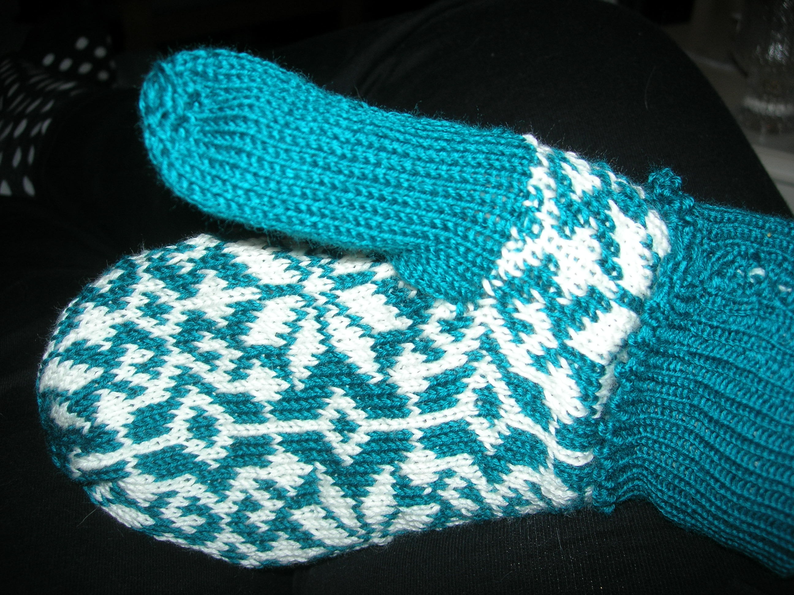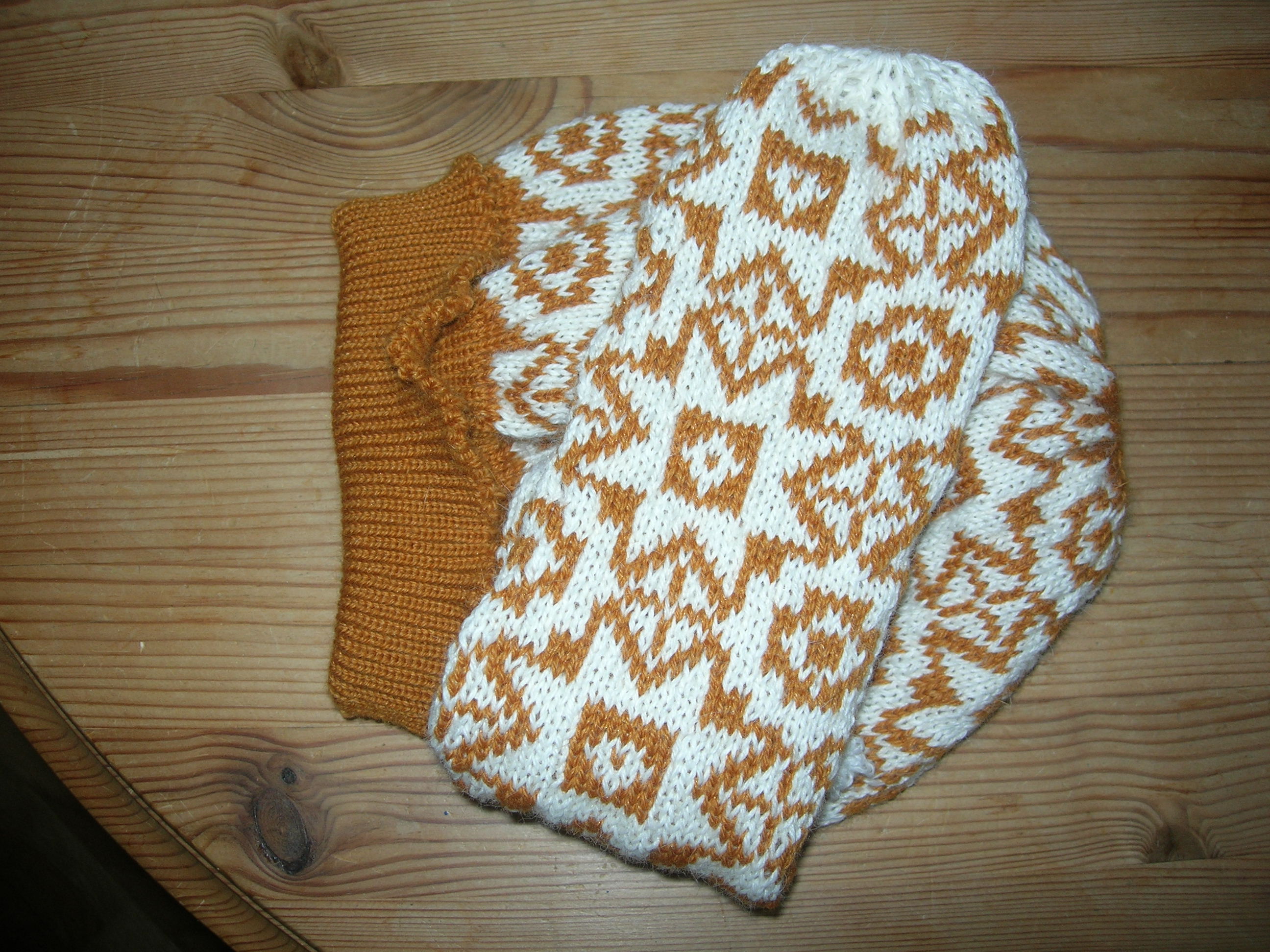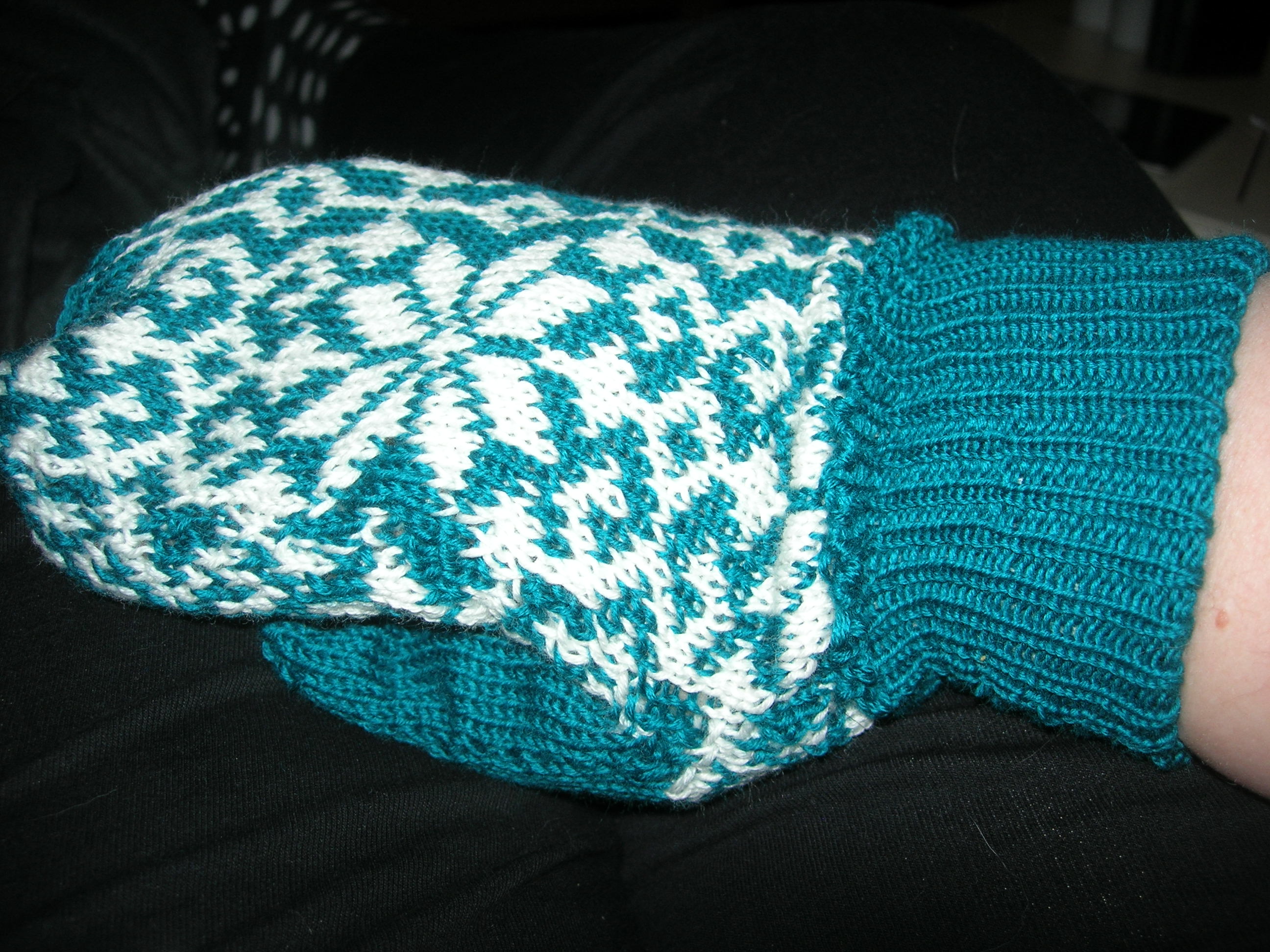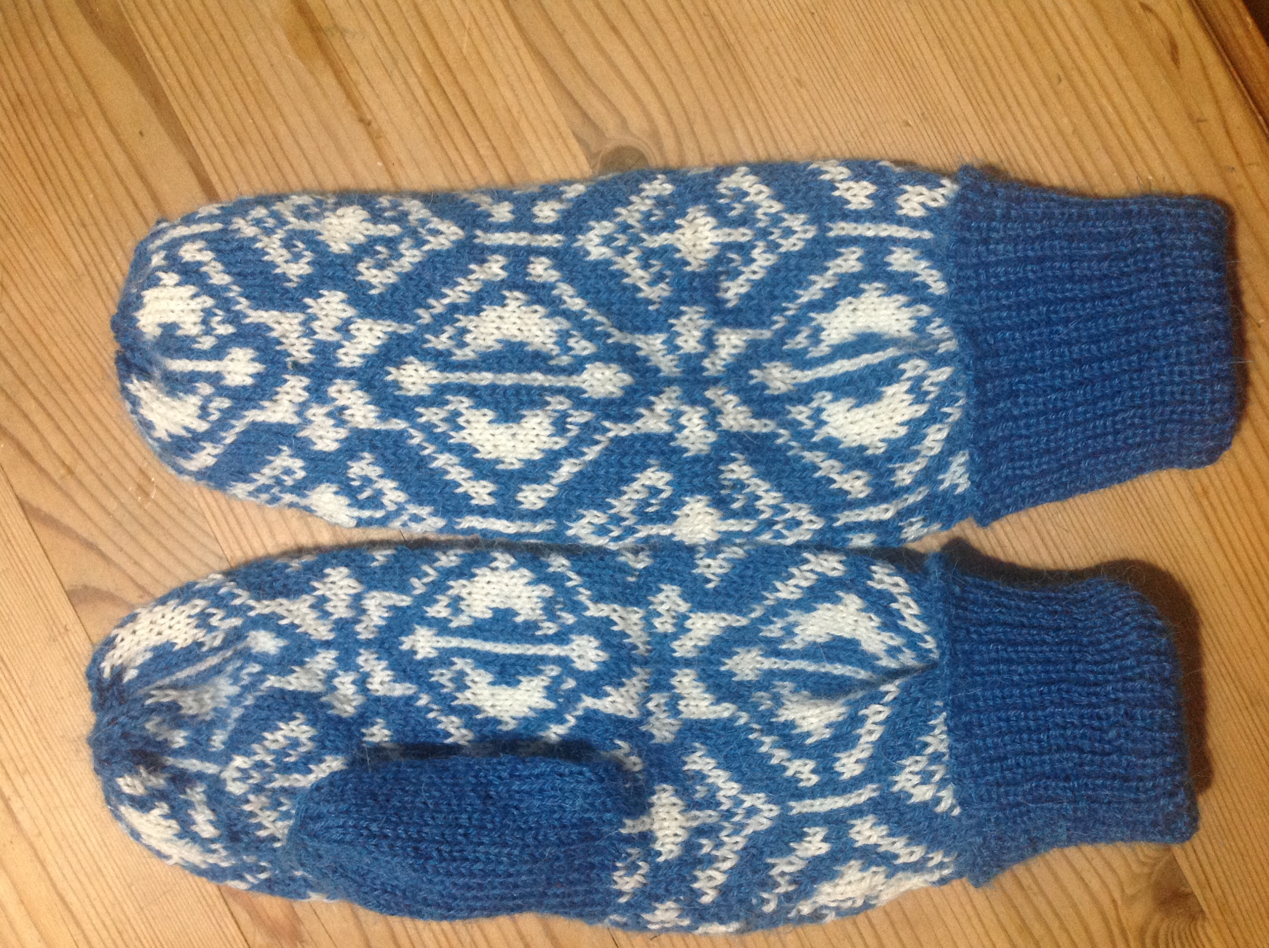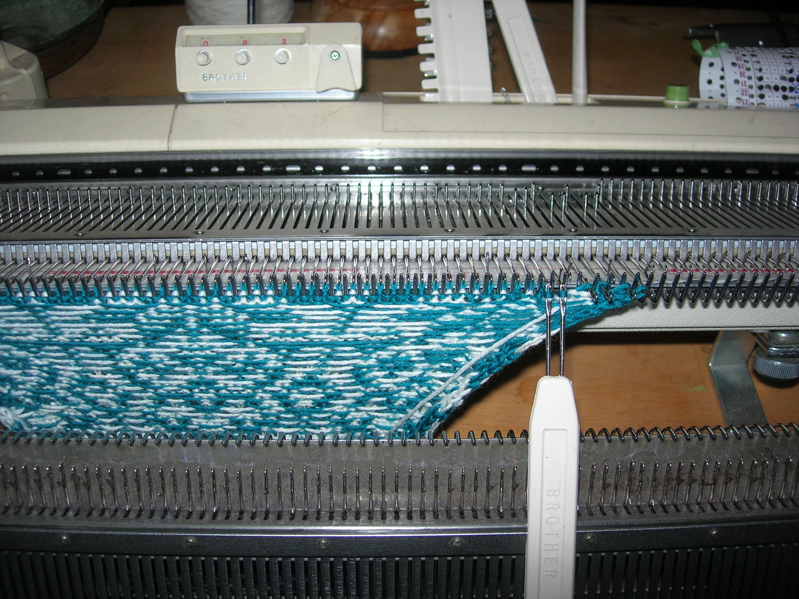 The Blue and white mittens are knitted with fair isle using card number 17 that came with my Brother knitting machine. The other two are made with designs from the book Ornaments and Patterns found in Iceland. I cast on with tension 1/1 and hang the small cast on comb and two large wights. I have used 3 rows of selvedge for this project before knitting the required rows of rib.