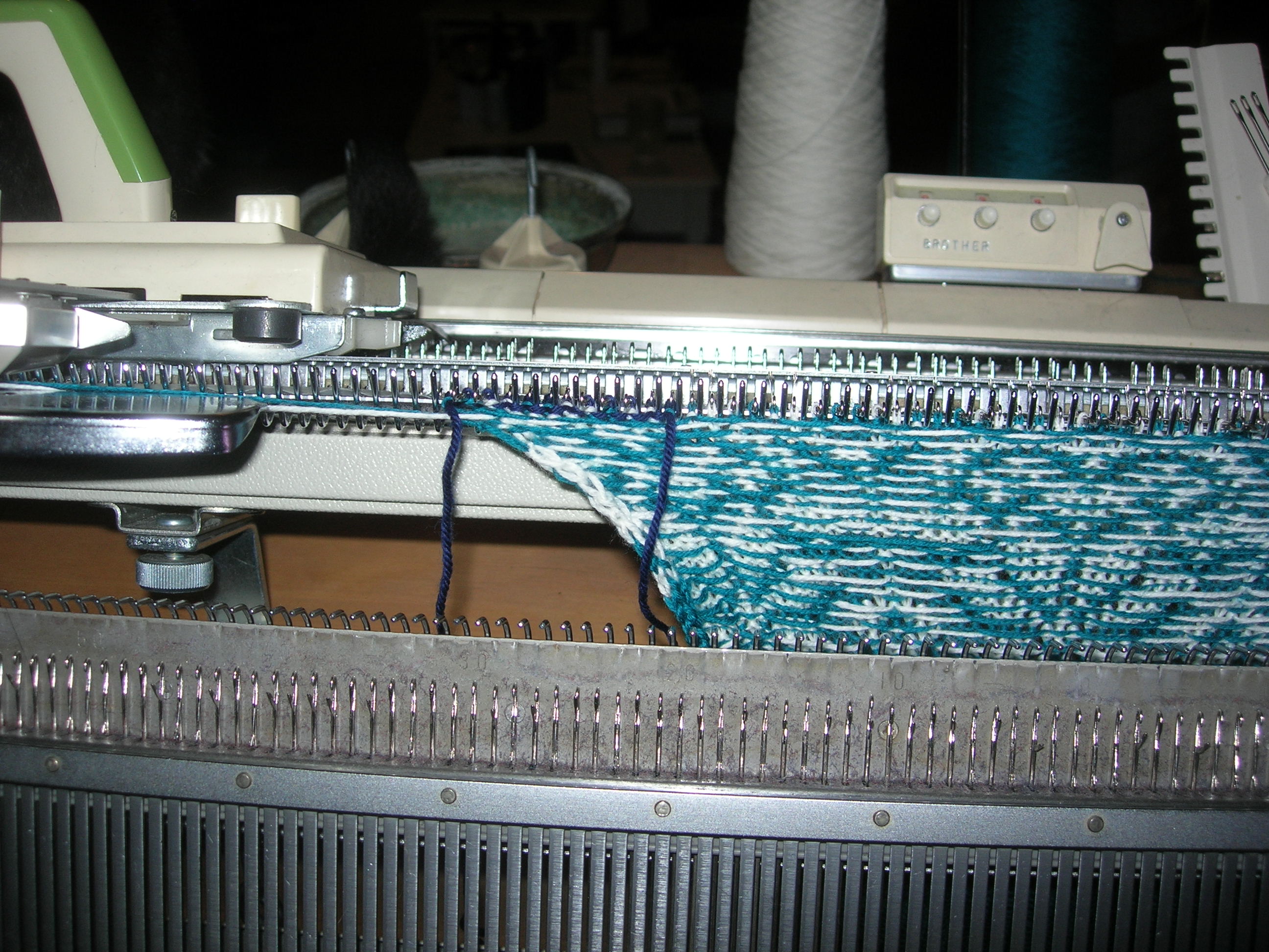 After transferring all the stitches from the ribber to the needle bed of the knitter the knitting machine is set to knit fair isle. The required rows of knitting up to the thumb are done and then 12 stitches are knitted on a different color of yarn for making the thumb later on and these stitches are then knitted again in the pattern. Make sure that the carriage is on the opposite side when you hand knit those stitches for the thumb.
