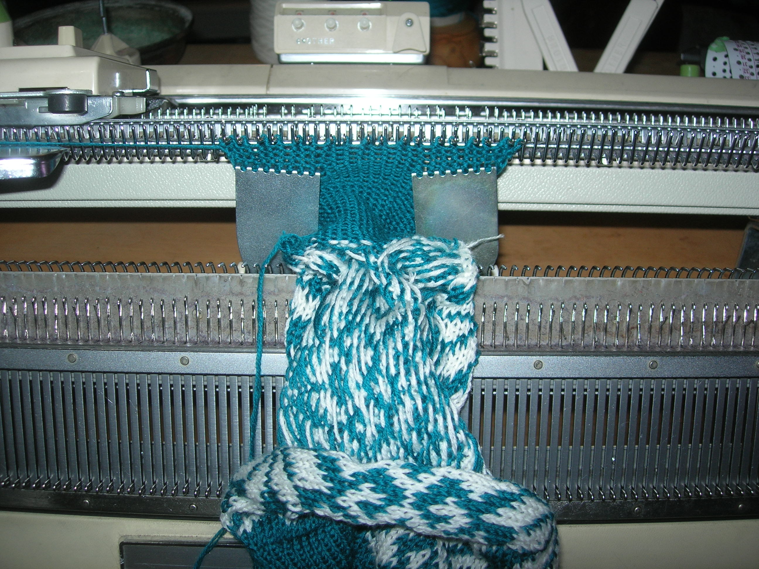 Rehang the project on the knitting machine, wrong side facing you. I use a piece of cardboard on the ribber to make sure that the project does not get hung up on the pegs of the ribber while I am doing this. Now knit the rows of the thumb and decrease stitches in the same manner as for the mitten.